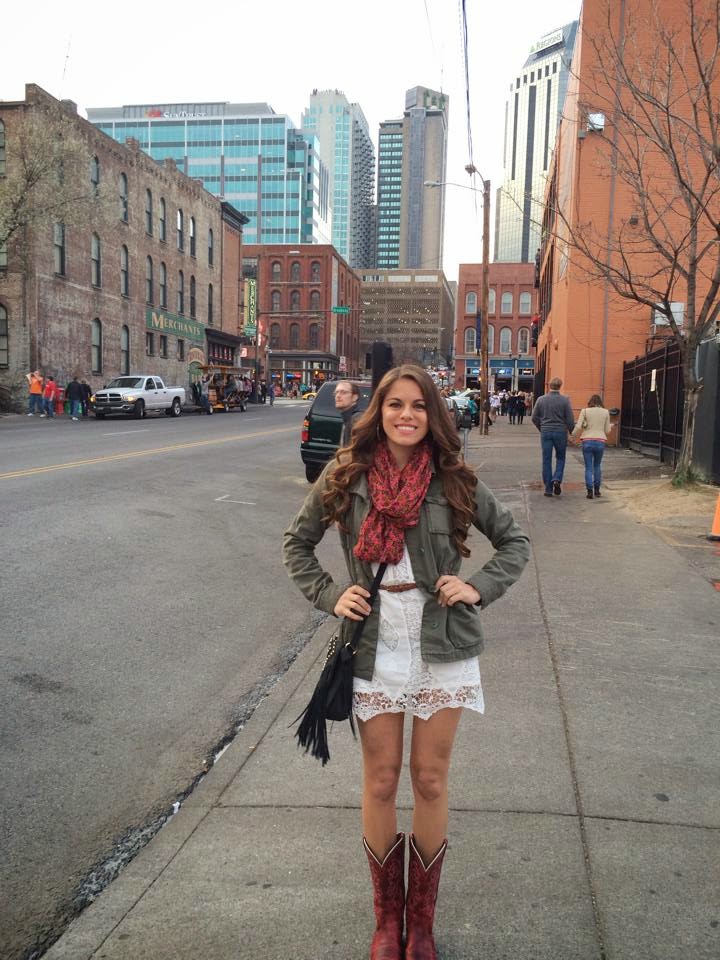This is myself on my trip to Nashville. The dress is white and 100% cotton with crochet detailing. The Military green jacket is 100% cotton and paired with a red and green patterned scarf that is 100% polyester. The red leather cowboy boots stand out, but when paired with the scarf, play into the color scheme. This brown leather belt accentuates the natural waist and simple gold earrings are used to accessorize. This outfit is for leisure and is more of a fall look due to the layering.